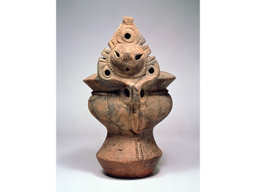 顔が外側を向いた珍しいスタイル。完全な形に復原された全国的にも数少ない土器として、国の重要文化財に指定されている。