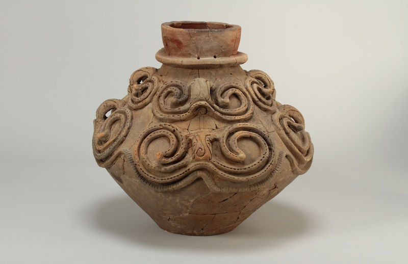 樽のような形をして、つばに孔が開いているところから、酒造りの道具とも、口に皮を張って太鼓として使用したともいわれる。口縁部の内外に赤色塗彩がみられる。