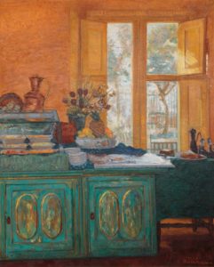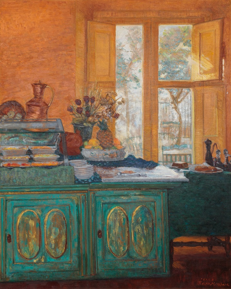 宮原先生は、はじめは故郷 岡谷や移住先の名古屋・神奈川などの風景を、木々の緑が印象的な、貞一郎によく似た筆致で描きます。1984年に取材旅行でヨーロッパを訪れ、その風景に魅了されてからは、スペインやギリシアの遺跡や風景を新たな題材として多くの作品を残しました。いずれの作品も一貫して、身の回りの何気ない風景や部屋の片隅の静物を安定した構図によって描き出したものです。そこには、宮原先生が最も影響を受け、尊敬する画家だという父 貞一郎から受け継いだ誠実さがあり、どこか懐かしい温かさに満ちています。