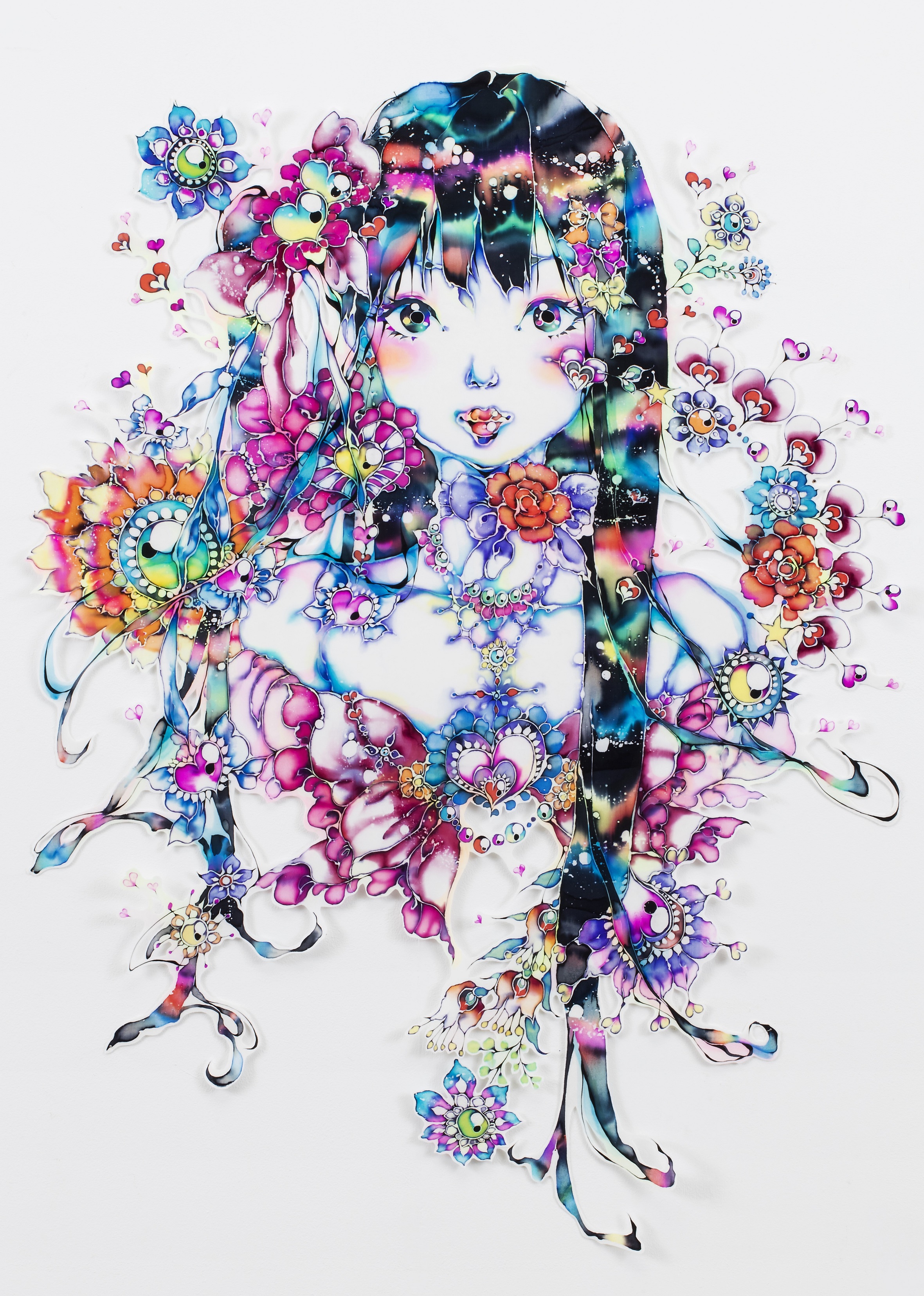 大竹はその伝統的な技法を現代的な感性によって少女絵を鮮やかにポップに描きます。上品な輝きを持つ絹を使い鮮やかな発色の酸性染料を使うことで、きらめく色彩を表現し、また染めた布を自由な形に切り取り組み合わせることによって、作品が布幅の制限されることなく無限の広がりをみせ、見るものを圧巻し不思議な世界へ誘います。