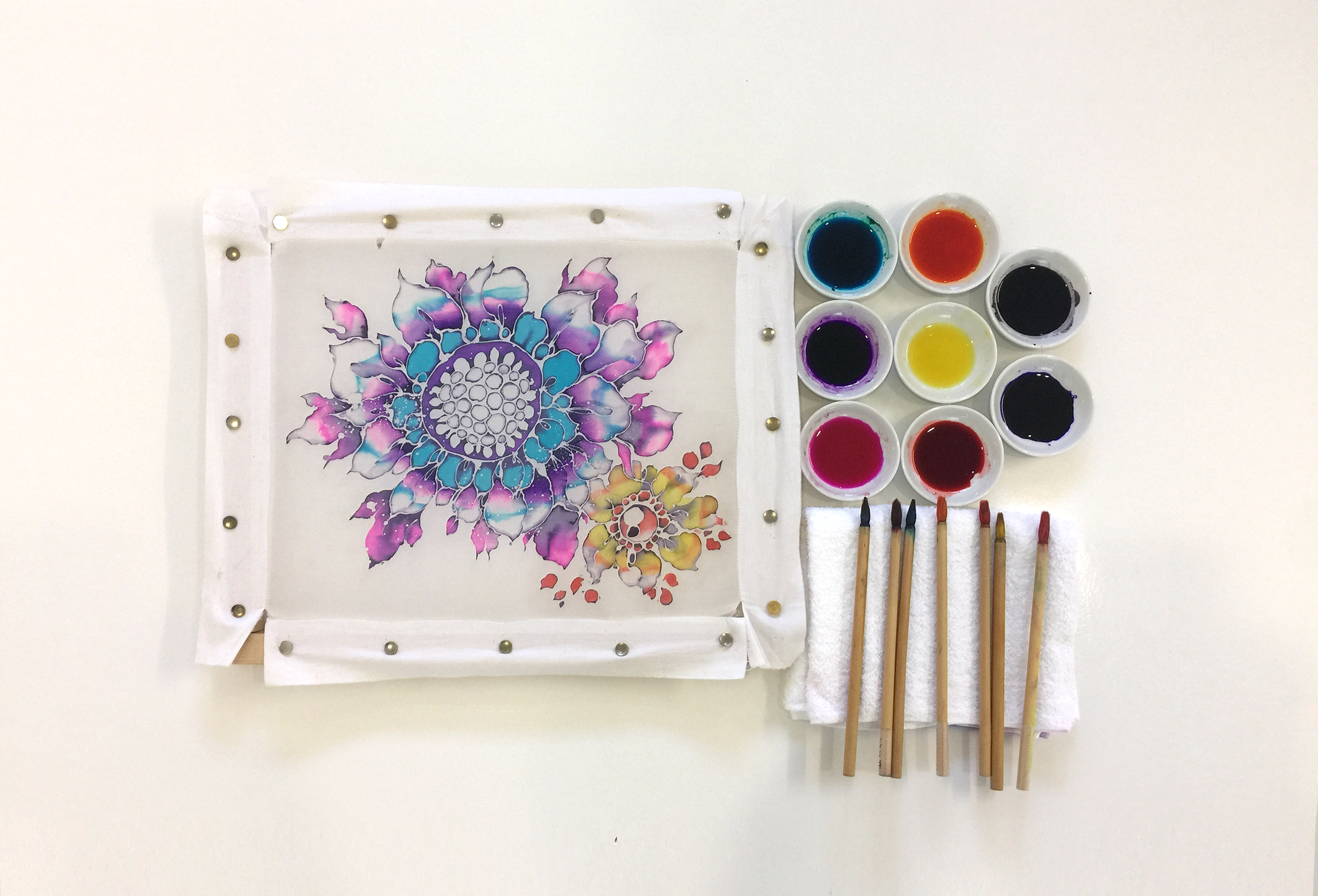 大竹夏紀は、群馬県富岡市の出身で小さい頃から絵を描くことが好きで、特に少女や花の絵を描いており、その華やかでキラキラした世界観に憧れ続けていました。その後、多摩美術大学にてテキスタイルデザインを専攻して「蝋けつ染め」に出会います。蝋けつ染めは、溶かした蝋を布地にしみこませることによって防染し柄を染める技法で、日本では正倉院宝物に見られるなど、天平時代から見られる伝統的な染色技法です。