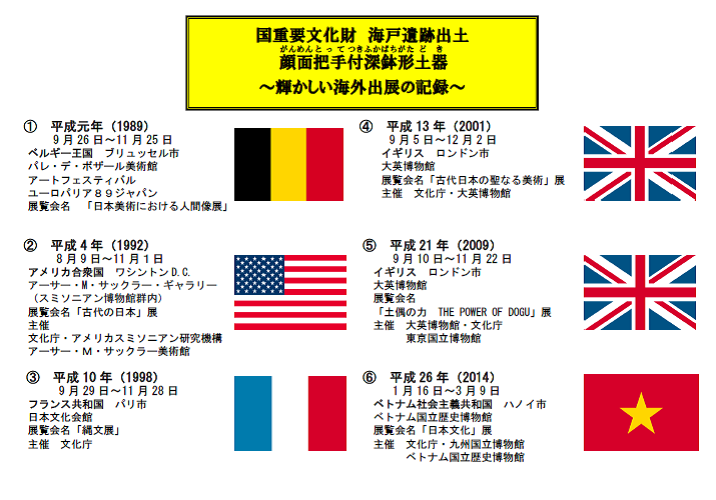 海戸遺跡出土 顔面把手付深鉢形土器の海外出展は、今回が初めてではありません。そのほかに、イギリス、フランス、ベルギーなど、多くの国に海外出展しています。